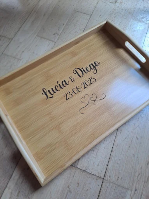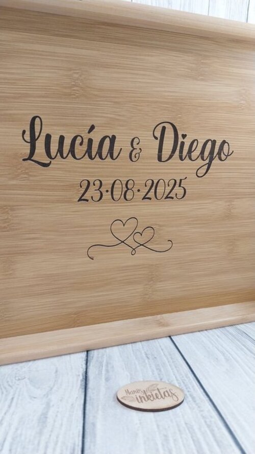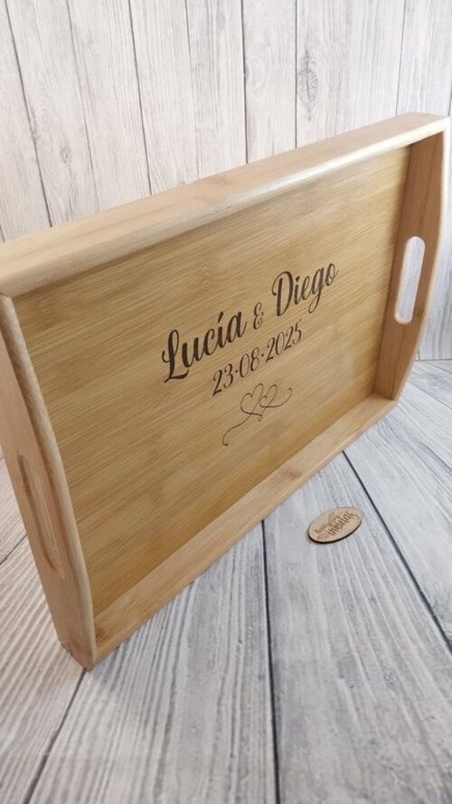 Hermosa bandeja de bambú personalizada para regalo de bodas. Son especiales para regalar a los novios en su gran día.