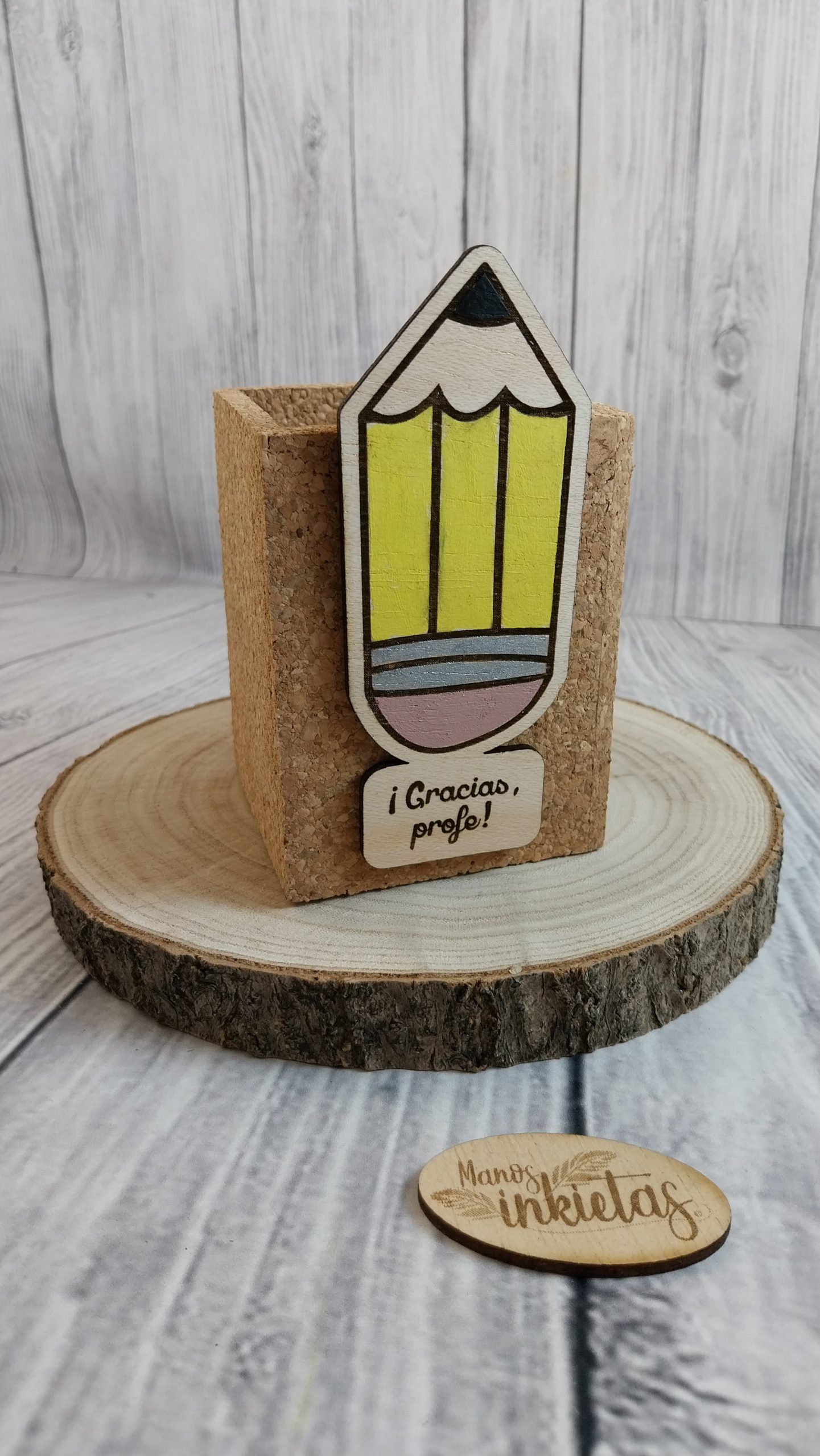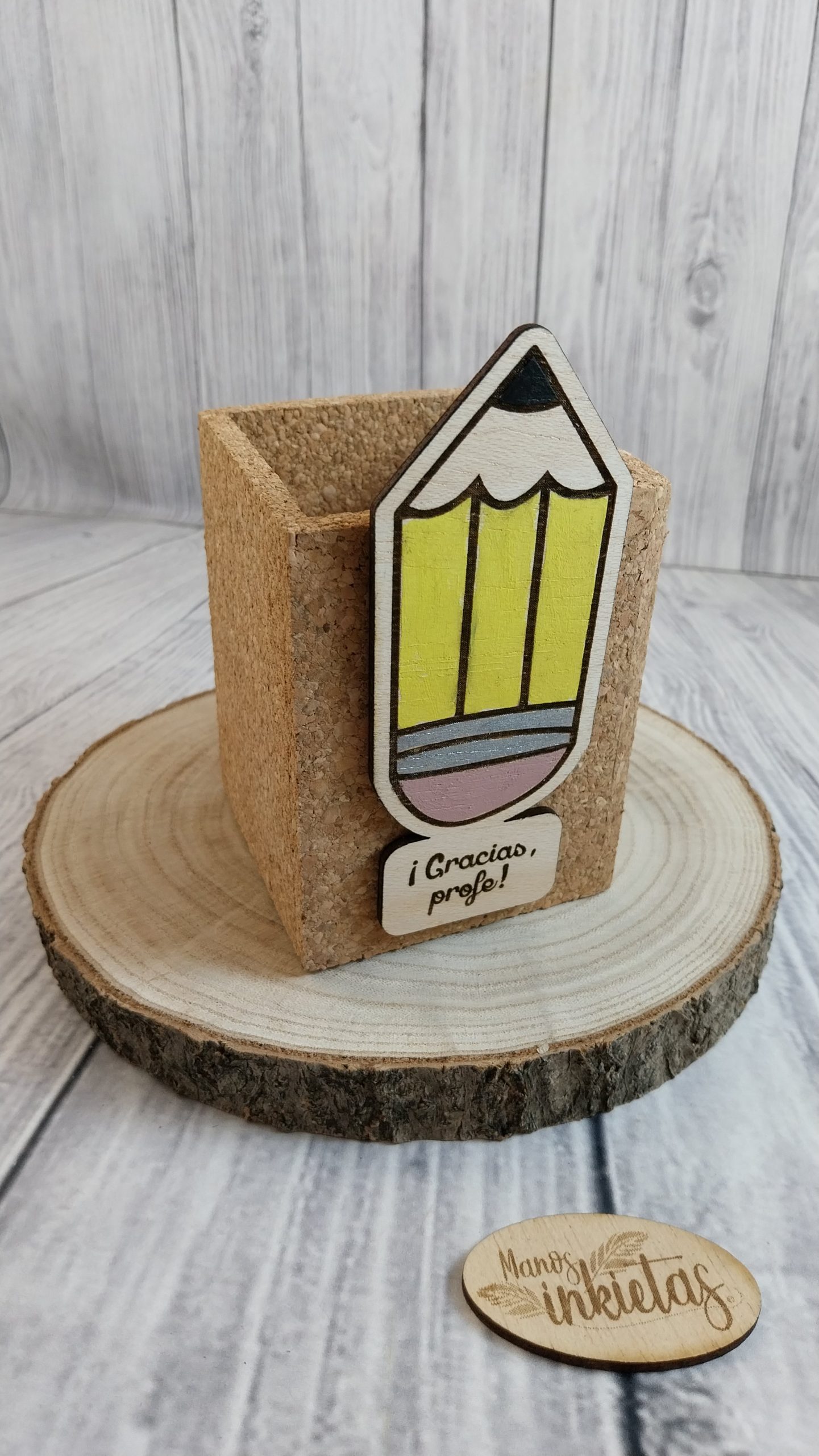 Hermoso y original portalápices personalizado de corcho con lápiz de madera pintado a mano para profes. Puedes personalizar este regalo para regalar en fin de curso o en cualquier ocasión especial o de agradecimiento para tu profe.
