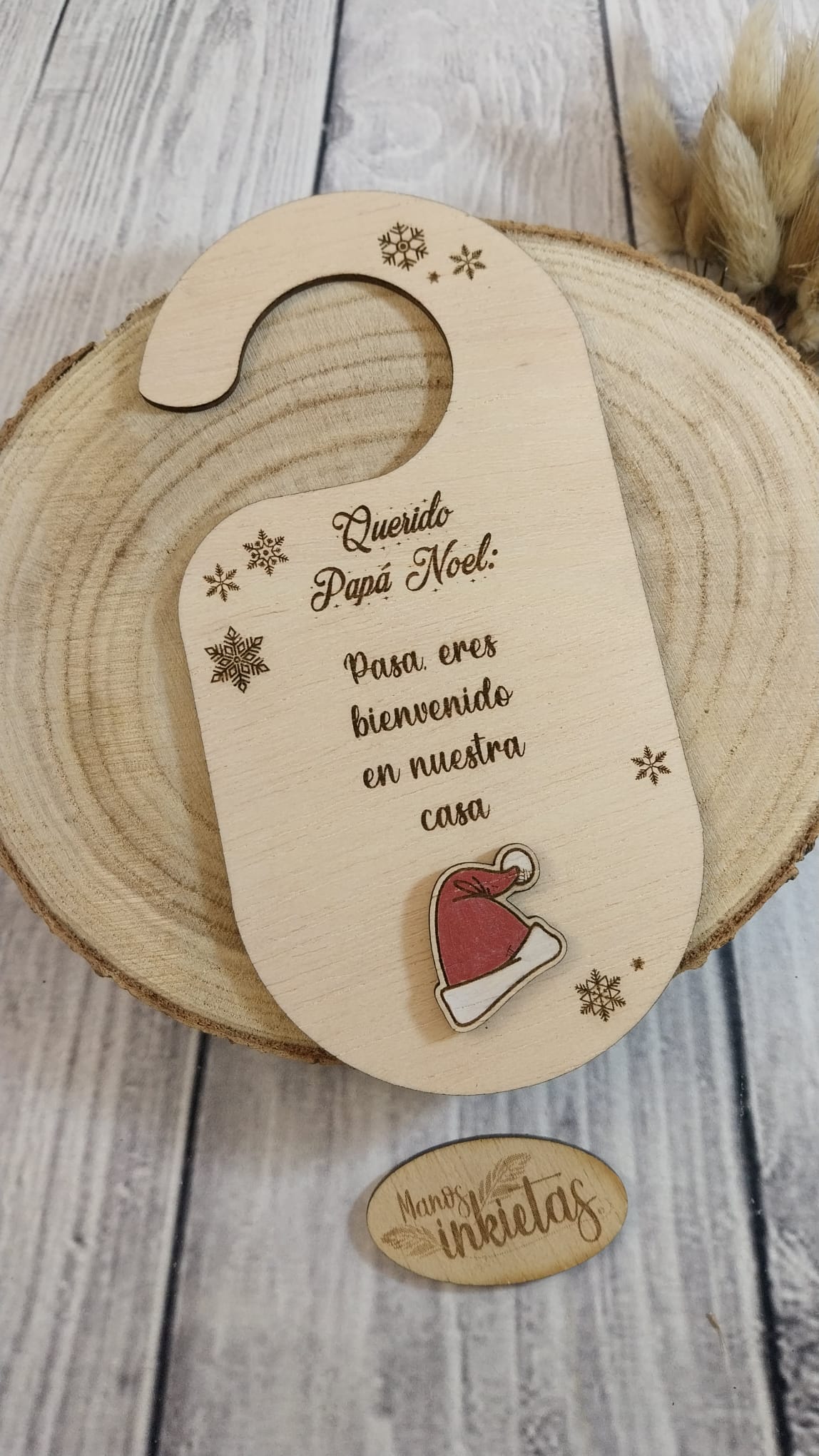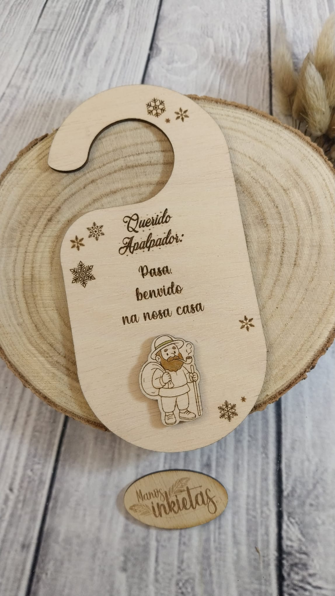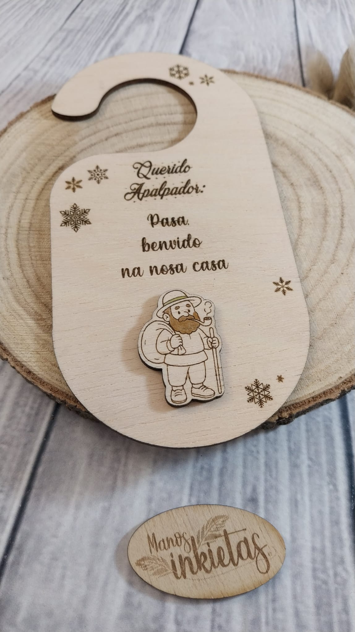 Hermoso y original Colgador para Puerta Papá Noel y Reyes Magos. Cada colgador de madera trae un mensaje dirigido a Papá Noel, Reyes Magos o el personaje de la cultura popular gallega, O Apalpador.