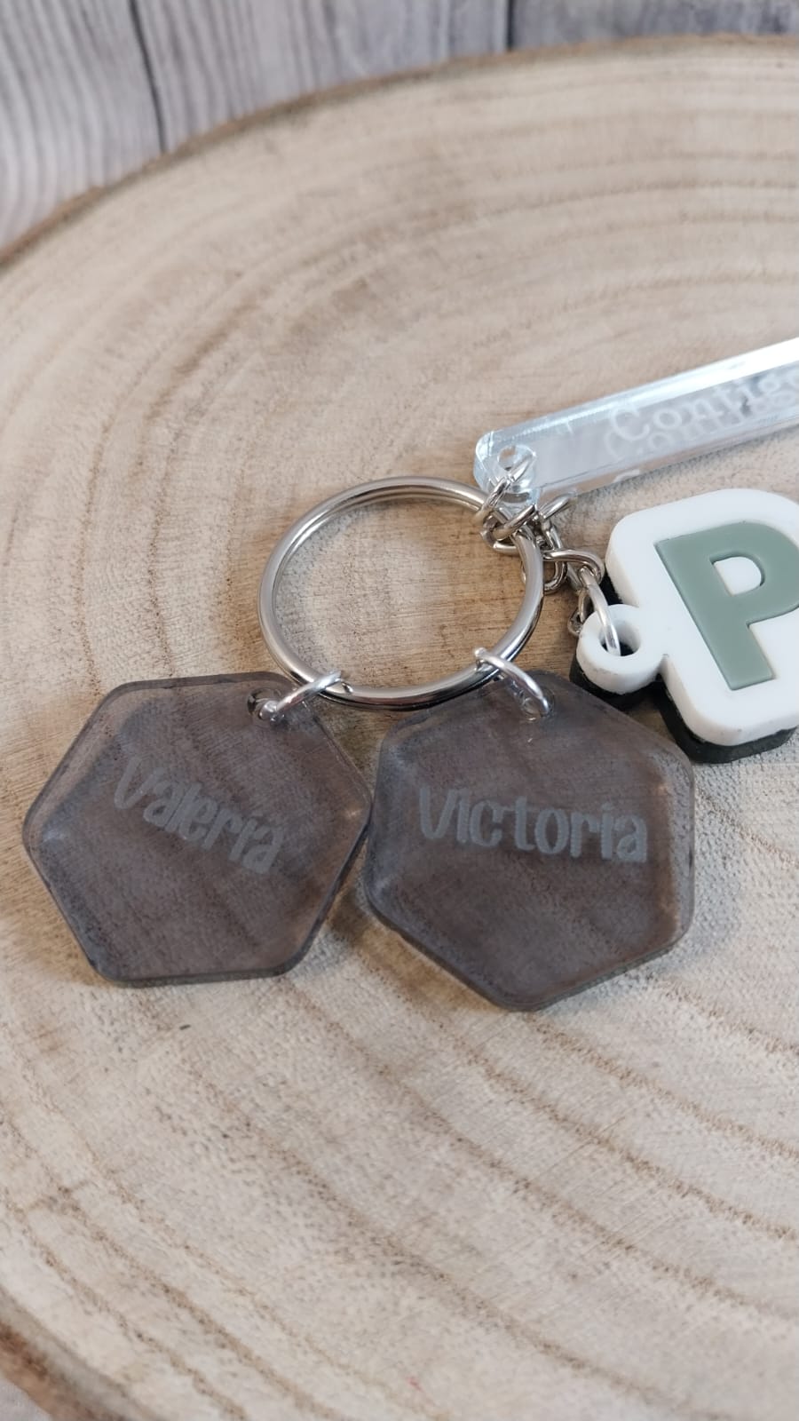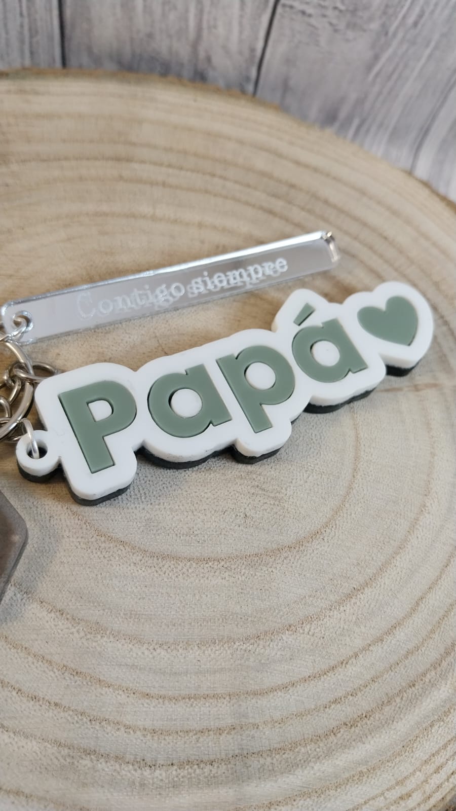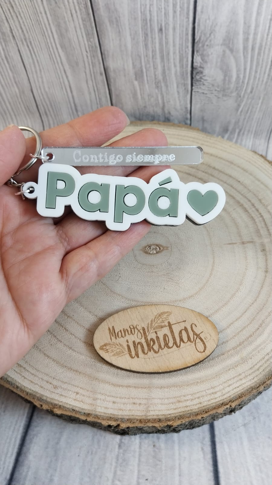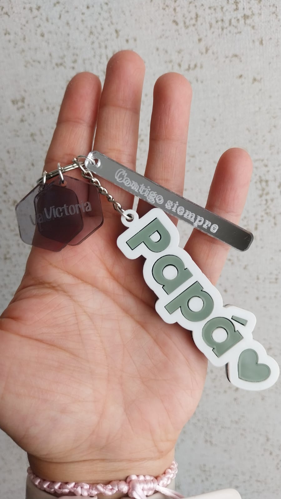 Cada llavero cuenta con una pieza principal Papá y un corazón al lado y lo complementa un detalle en metacrilato plata con la frase Contigo siempre. Luego, puedes añadir el o los nombres de tus hijos en una medallita en metacrilato gris transparente.